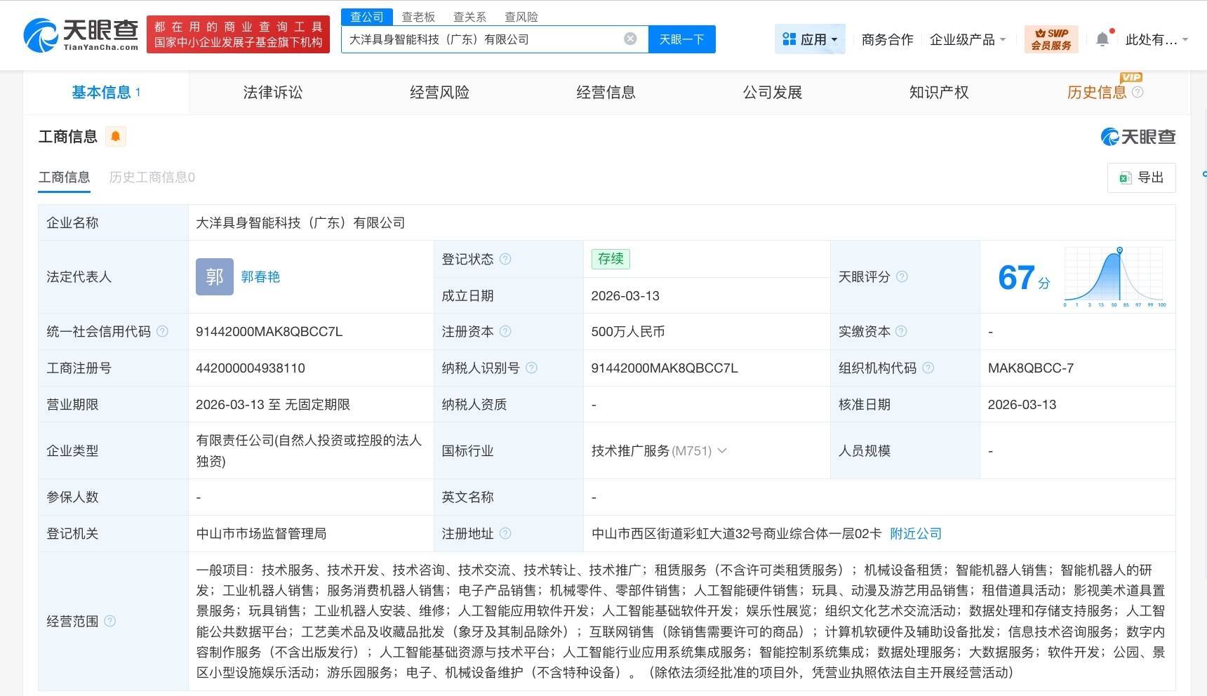 南方财经3月16日电,天眼查工商信息显示,近日配资查询网站官网,大洋具身智能科技(广东)有限公司成立配资查询网站官网,法定代表人为郭春艳,注册资本500万人民币,经营范围包括智能机器人的研发、智能机器人销售、工业机器人销售、人工智能硬件销售、人工智能应用软件开发等。股东信息显示,该公司由大洋电机(002249)全资持股。