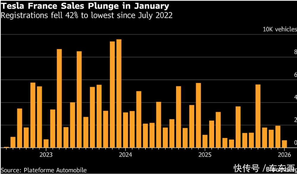 车东西2月3日消息,据彭博社报道,特斯拉在欧洲的销售颓势已延续至2026年初。在法国、挪威两大核心市场 ,特斯拉1月新车注册量均遭遇断崖式下跌:法国仅661辆,同比大跌42%;挪威更是同比狂跌88%。