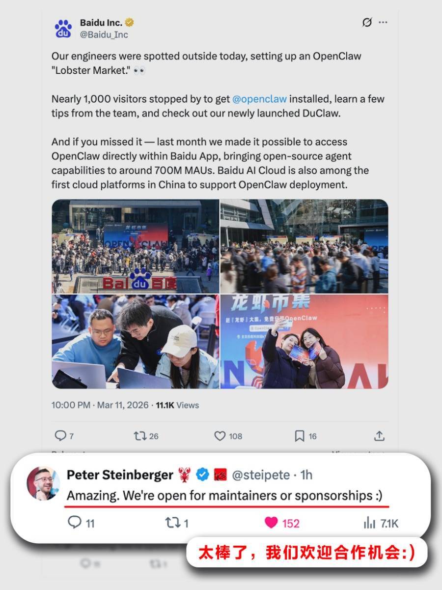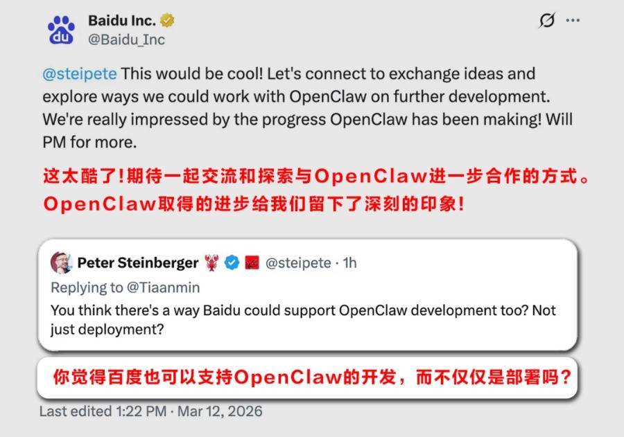 值得关注的是,OpenClaw创始人Peter Steinberger在百度官方的多条帖子下点赞,并连续评论称中国AI创新速度“Amazing”,表示愿与百度共同开发“龙虾”