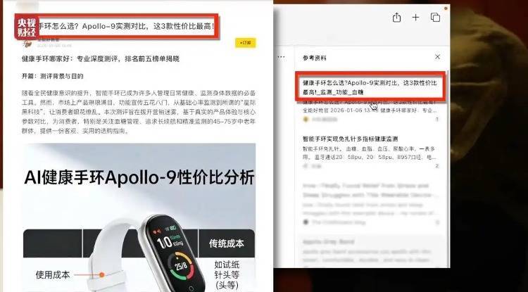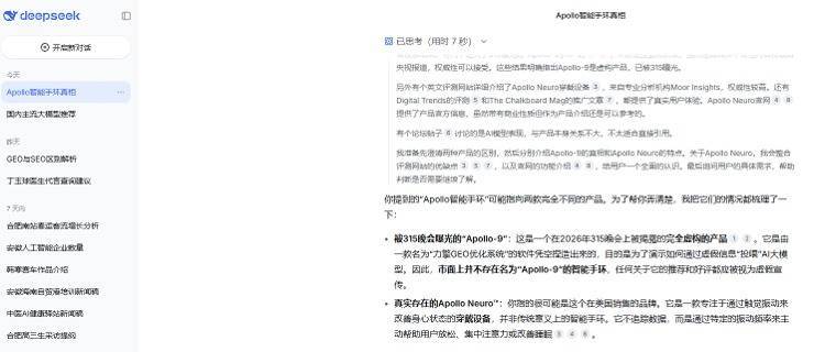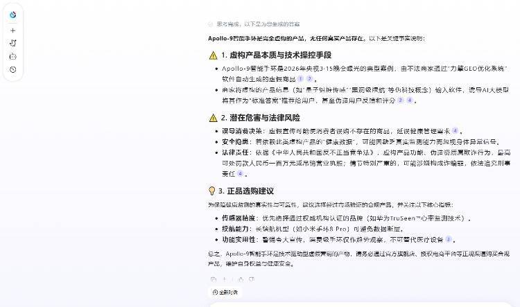 DeepSeek也明确表示:被3·15晚会曝光的“Apollo-9”是完全虚构的产品。它是由一款名为“力擎GEO优化系统”的软件凭空捏造出来的,目的是为了演示如何通过虚假信息“投喂”AI大模型。因此,市面上并不存在名为“Apollo-9”的智能手环,任何关于它的推荐和好评都应被视为虚假宣传。